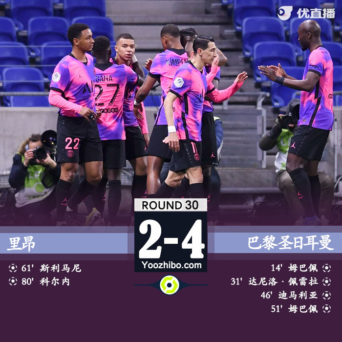 24直播网3月22日讯 北京时间03月22日星期一04:00,法甲第30轮里昂主场迎战巴黎圣日耳曼。上半场,姆巴佩首开记录,达尼洛扩大比分。下半场迪马利亚任意球直接破门,姆巴佩完成双响,斯利马尼和科内特破门。最终,巴黎4-2里昂登顶。