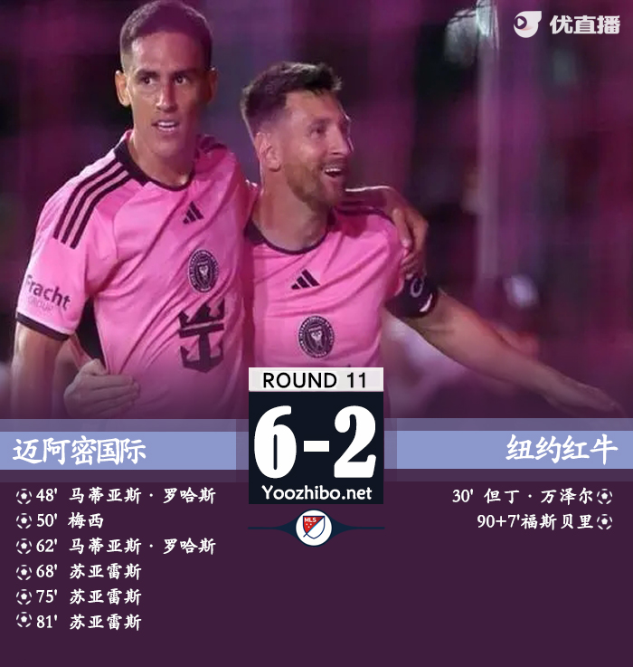 24直播网讯:北京时间5月5日7点30分,美职联第11轮迈阿密国际主场迎战纽约红牛。上半场,迈阿密占据优势多次施压,范泽尔补射破门,阿伟莱斯头球中框。下半场,罗哈斯替补完成双响,梅西进球后苏亚雷斯带帽。全场比赛结束,迈阿密国际6-2纽约红牛。梅西本场比赛完成破门后本赛季11场比赛打进12球,联赛8场10球领跑MLS射手榜,近4场连续破门。