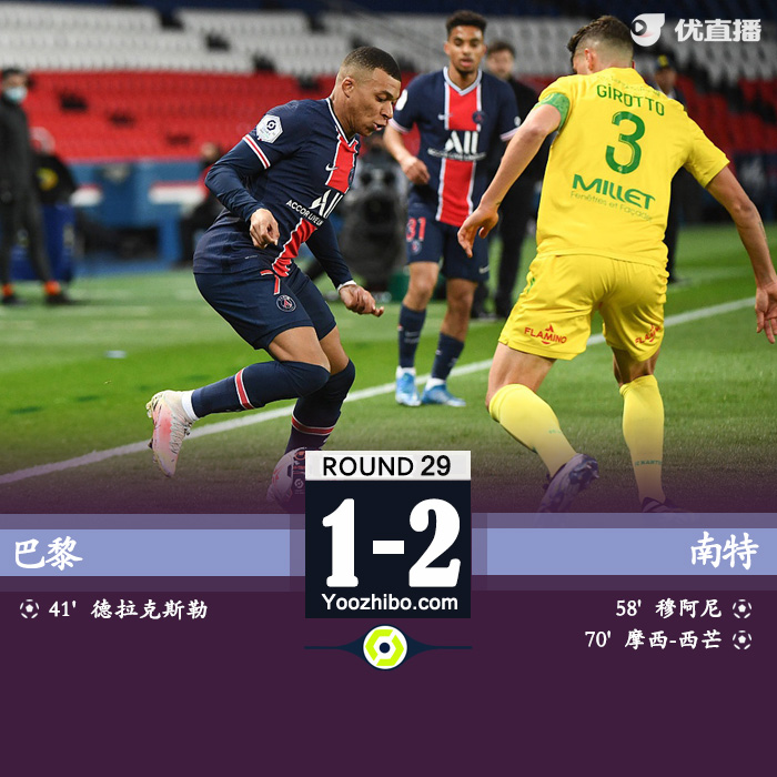 24直播网3月15日讯 北京时间03月15日星期一04:00,法甲第29轮巴黎圣日耳曼主场迎战南特。上半场,德拉克斯勒破门,巴黎半场1-0领先南特。下半场,姆巴佩回传失误送礼,穆阿尼传射,西芒反超比分。最终,巴黎主场爆冷1-2遭南特逆转。