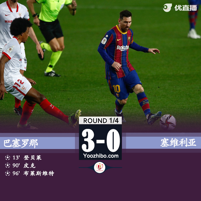 24直播网3月4日讯 北京时间3月4日凌晨04:00,国王杯半决赛次回合巴塞罗那主场迎战塞维利亚。上半场,登贝莱平地起惊雷惊艳世界波,巴萨半场1-0领先塞维利亚。下半场,明格萨犯规送点,特尔施特根扑点,费尔南多被罚下,皮克压哨破门,巴萨总比分2-2塞维将比赛拖入加时。加时上半场,布莱斯维特破门。最终全场比赛结束,巴萨3-0,总比分3-2逆转塞维利亚进决赛。巴萨国王杯决赛对手,将会是莱万特vs毕尔巴鄂的胜者。