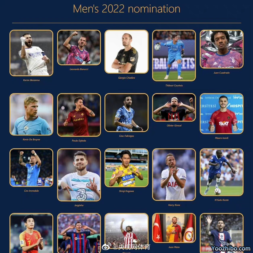 本泽马、博努奇、基耶利尼、库尔图瓦、夸德拉多、德布劳内、迪巴拉、法布雷加斯、吉鲁、伊卡尔迪、