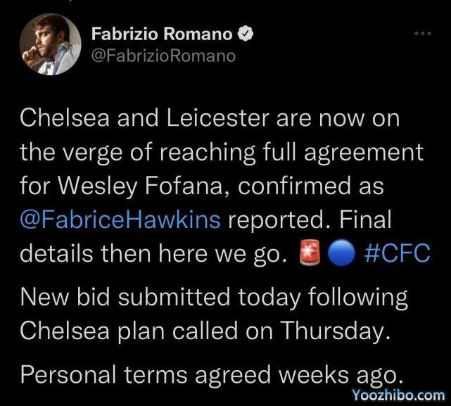 此前,切尔西曾两次为这位法国中卫提出报价,但都被莱斯特城拒绝,但现在双方已经达成了突破。切尔西在当地时间周五下午提交了新报价,这份报价最终得以被莱斯特城所接受,双方俱乐部已经只剩下最后的细节需要确认。福法纳将会与切尔西签约6年,至2028年。