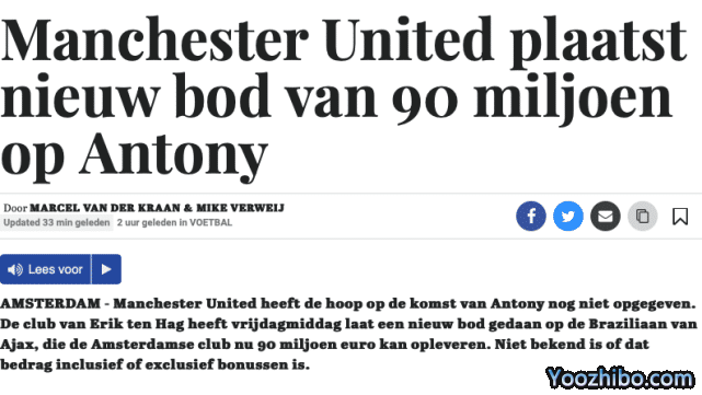 2000年出生的安东尼司职右边锋,上赛季代表阿贾克斯出战33场比赛,收获12粒进球和10次助攻。本赛季已在3场比赛中收获2球2助。由于安东尼与阿贾克斯还有3年合同在身,荷甲霸主依然是占据转会谈判的主动一方。