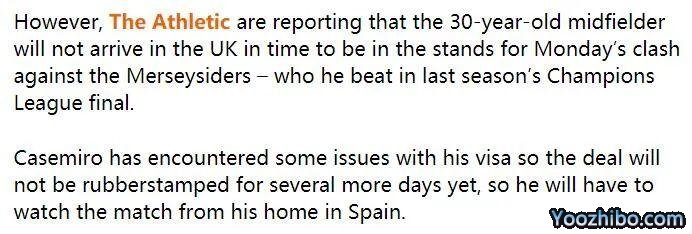 这一安排当时得到了名宿乔科尔的赞赏,「难以置信!这是索尔斯克亚的聪明安排,如果你想让观众兴奋起来,就让瓦拉内这样的大牌球星亮相。这么做了之后,球迷会站起来,让气氛变得热烈。」他说。曼联最终5-1取得开门红,博格巴4次助攻,布鲁诺·费尔南德斯大演帽子戏法。人们自然希望这次卡塞米罗也能带来类似的作用,但英媒给出了不同的看法,「竞技网」(The Athletic)称,卡塞米罗将无法及时抵达英格兰,或许连现场观战都无法做到。卡塞米罗的签证申请遇到了一些问题,这笔交易还需要几天才能完成签约,他将不得不在西班牙的家中观看双红会。