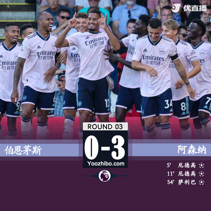 第54分钟,阿森纳再入一球,马丁内利右路起球,扎卡后点胸部停下皮球后做球,萨利巴迎球左脚打门飞入球网,阿森纳3-0领先伯恩茅斯。