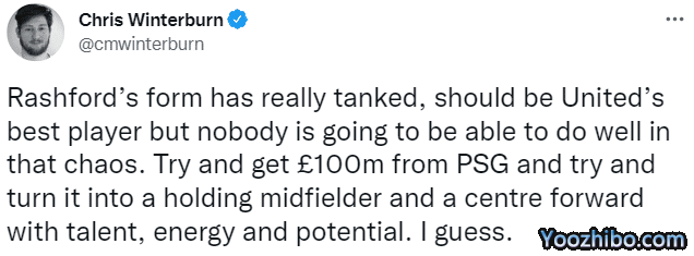 这位记者在推特上说道:“拉什福德状态确实很糟糕,他本应是曼联最好的球员,但在球队这种混乱的局面下,没有人能有好的表现。”