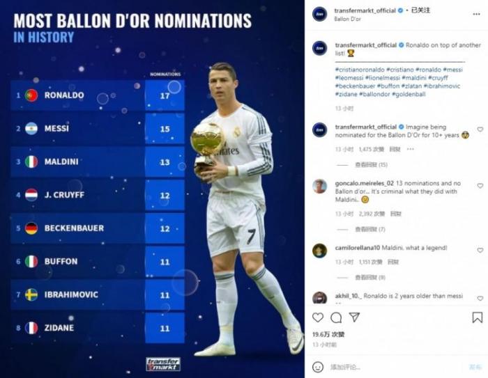 来源:24直播网10-31 11:1124直播网10月31日讯 金球奖不久后就要揭晓,今日,德转盘点了足球史上金球奖提名次数最多的球员,其中C罗17次位居第一,梅西第二。
