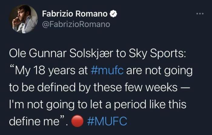 索尔斯克亚告诉天空体育:“我的18年曼联时光,不会被这几周所定义。我不会让这样的一个时期定义我。”