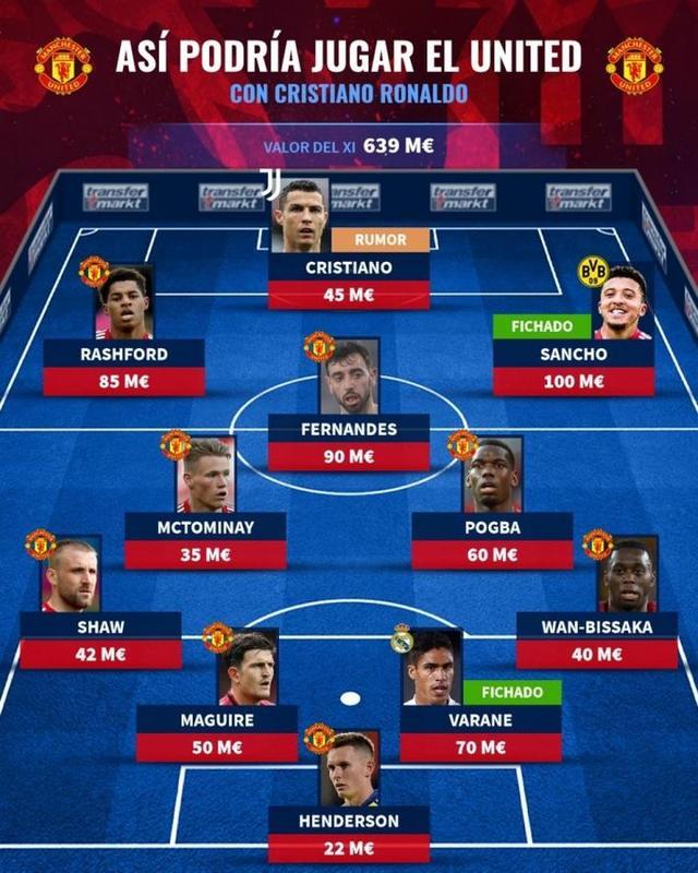前场:拉什福德(8500万欧)、C罗(4500万欧)、桑乔(1亿欧)