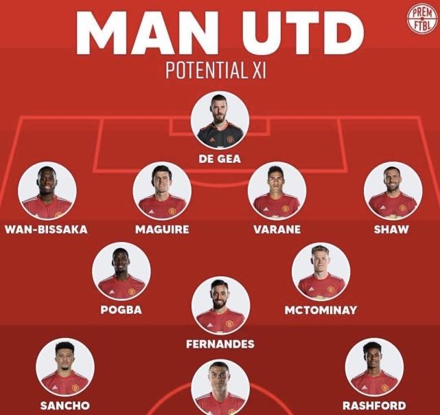 中场三人组则是博格巴、B费、麦克托米奈,锋线三叉戟则是桑乔、拉什福德和C罗。替补席上,曼联还有卡瓦尼、格林伍德等上赛季表现优异的攻击手,可以说这套首发堪称是曼联近几个赛季最强的阵容了,放在全欧洲也属于顶级水平。