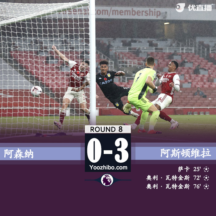 北京时间11月9日3:1524直播网讯,英超第8轮,阿森纳迎战阿斯顿维拉。上半时萨卡乌龙送礼。下半时沃特金斯斩双响。最终,阿森纳0-3阿斯顿维拉。本场战罢,维拉15分,阿森纳12分。