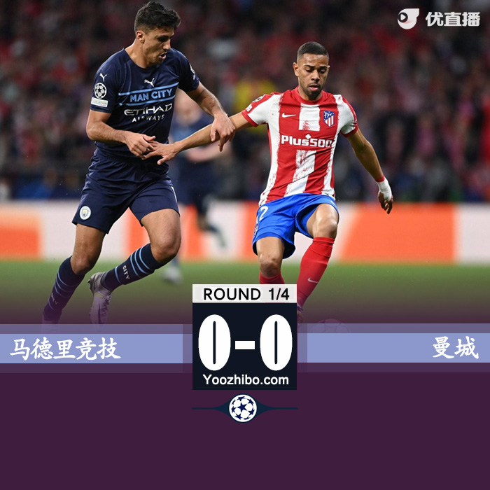 24直播网4月14日讯 北京时间4月14日凌晨3时,2021-2022赛季欧冠四分之一决赛次回合展开角逐,曼城客场对阵马德里竞技。上半场双方均无建树,京多安有一脚射门击中立柱。曼城半场0-0战平马德里竞技。下半场双方也没有进球,沃克因伤下场,费利佩染红。最终曼城客场0-0战平马德里竞技,以两回合总比分1-0淘汰对手,曼城晋级欧冠半决赛,将对战皇家马德里。