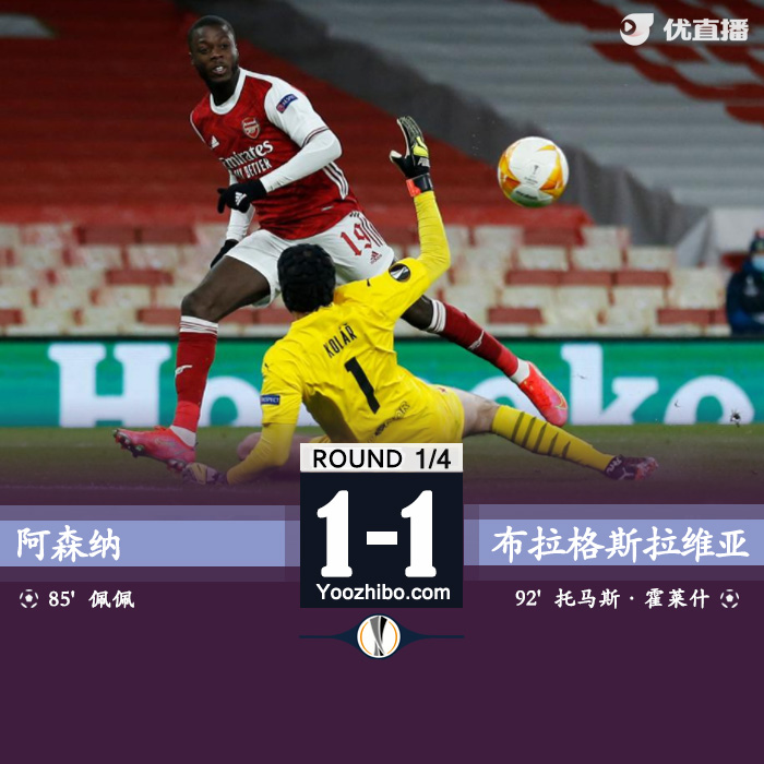 24直播网4月9日讯 北京时间04月09日星期五03:00,欧联杯1/4决赛首回合阿森纳迎战布拉格斯拉维亚。上半场,枪手没有创造出明显进球机会,阿森纳半场暂0-0布拉格斯拉维亚。下半场,威廉任意球中柱,拉卡泽特超级单刀中框,佩佩替补登场破门,霍尔斯头球读秒绝平。最终,阿森纳主场1-1斯拉维亚。