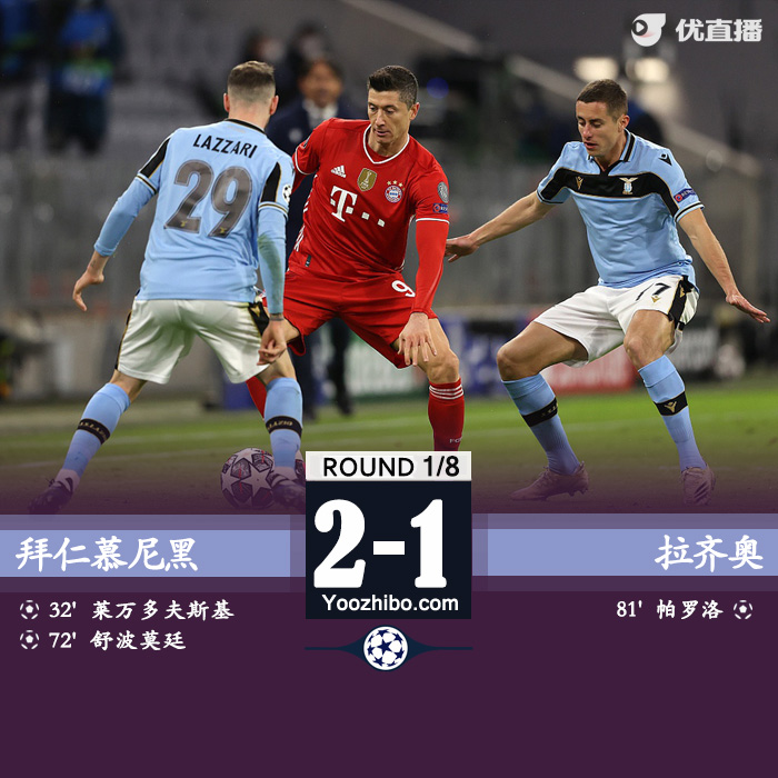 24直播网3月18日讯 北京时间3月18日凌晨4时,20-21赛季欧冠1/8决赛次回合,拜仁主场迎战拉齐奥。上半时场面比较平淡,格雷茨卡造点,莱万点射破门。下半时阿拉巴助攻舒波莫廷破门,帕罗洛扳回一分,莱万中柱,科雷亚单刀球被努贝尔扑出。最终,拜仁慕尼黑2-1拉齐奥,总比分拜仁6-2拉齐奥晋级八强。