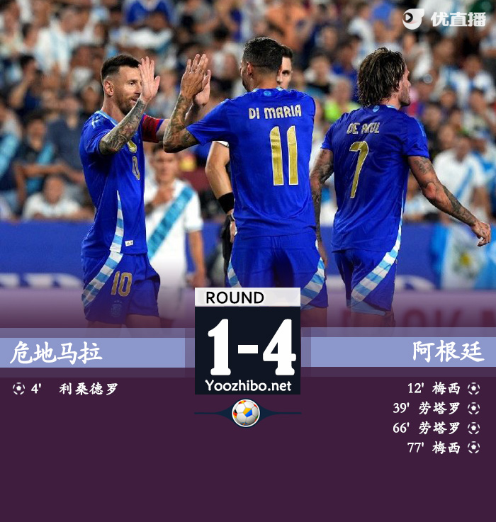 24直播网讯:北京时间6月15日08:00,国际足球友谊赛阿根廷挑战危地马拉的比赛,上半场马丁内斯乌龙球,哈根失误梅西推射空门扳平比分,卡博尼造点,劳塔罗点射反超比分,半场结束,阿根廷2-1危地马拉。下半场梅西助攻劳塔罗破门扩大比分,迪马利亚助攻梅西再下一城,最终阿根廷4-1逆转危地马拉,阿根廷将在6月21日迎来美洲杯首战。