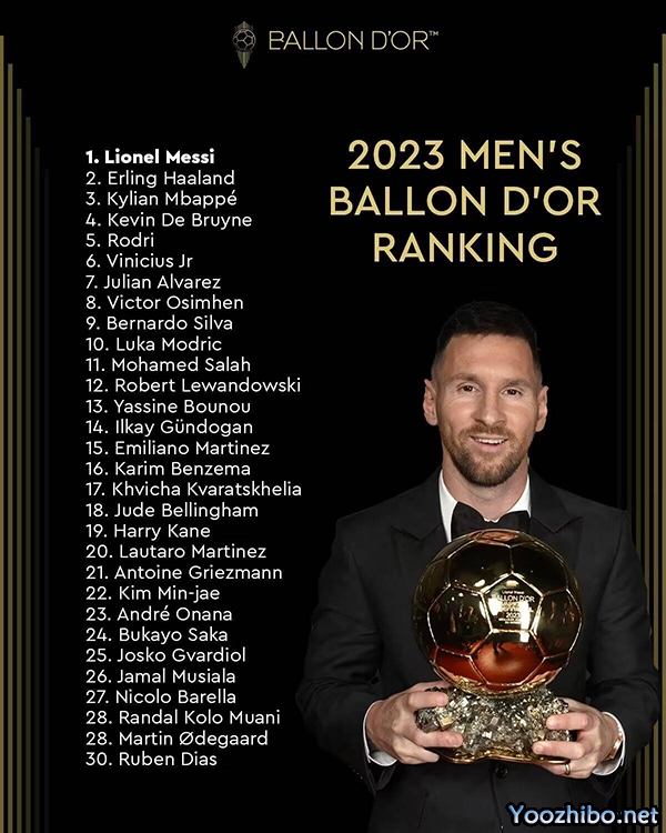 榜单第三位为带领法国杀入世界杯决赛,并在决赛上演帽子戏法的姆巴佩。由于收获历史性的三冠王荣耀,曼城球员在榜单TOP10中占据了5席,德布劳内与罗德里力压皇马球员维尼修斯,分居第四第五位。