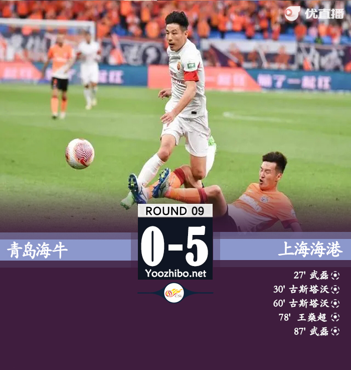 24直播网讯:北京时间5月1日晚上18:00,中超第9轮,青岛海牛主场迎战上海海港。上半场,巴尔加斯妙传助攻武磊单刀破门,武磊助攻古斯塔沃再下一城,古斯塔沃、奥斯卡先后进球被吹。下半场,奥斯卡助攻古斯塔沃头槌得手,王燊超抽射破门,武磊笑纳单刀。全场结束,青岛海牛0-5上海海港。本场过后,上海海港5胜3平积18分暂居第2,青岛海牛2胜1平6负积7分排名倒数第2。