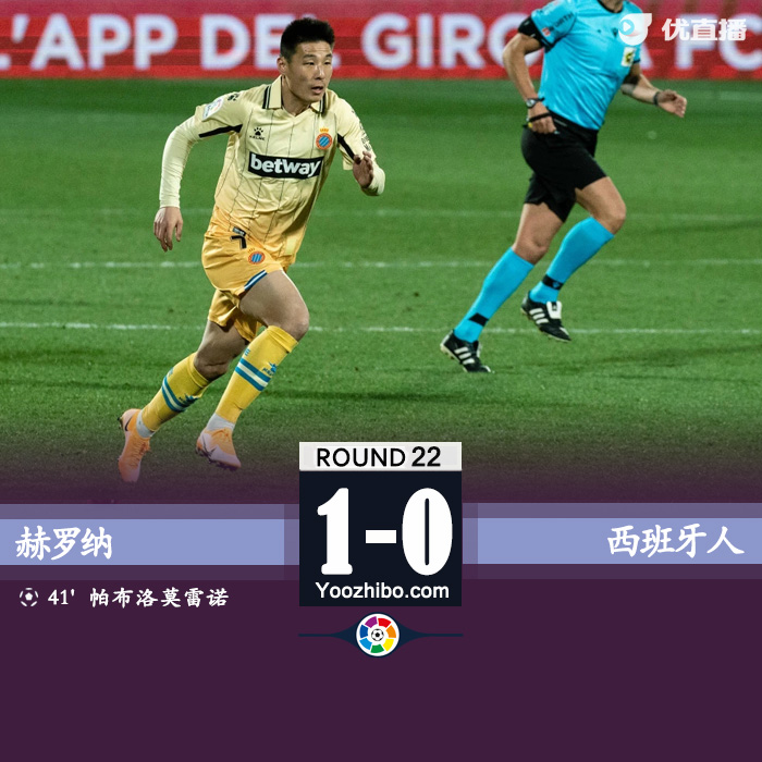 24直播网1月24日讯 北京时间1月24日01:15,西乙第22轮,西班牙人客场挑战赫罗纳。上半场,恩巴尔巴远射中柱,帕布洛-莫雷诺助赫罗纳取得领先;下半场,普阿多头球中柱,武磊第77分钟替补登场,但没有太多机会。最终,西班牙人客场0-1不敌赫罗纳。